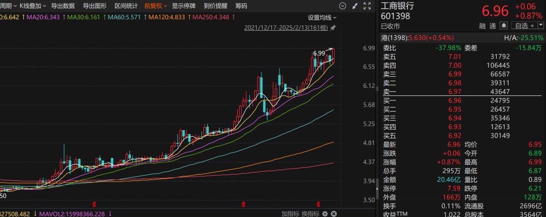Choice数据显示,截至2月13日收盘,工商银行A股(601398)股价报收6.96元/股、工商银行H股(01398)股价报收5.630港元/股,均创下历史新高。此外,6家国有大行A股纷纷收涨,国有大型银行板块(申万二级行业分类)收涨0.57%。