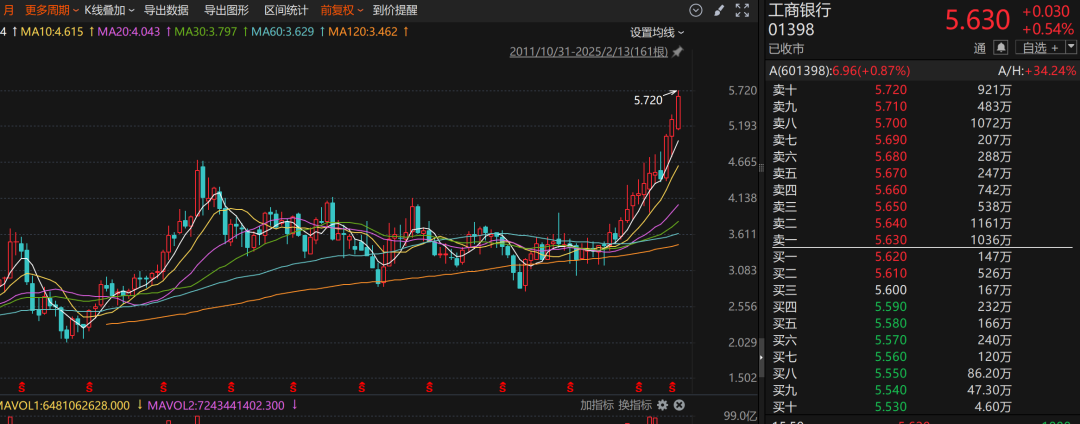 工商银行A股和H股股价均再创历史新高。