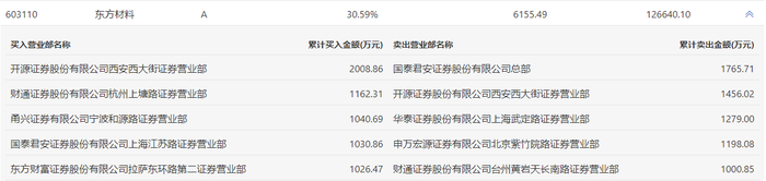 东方材料2月13日涨停,龙虎榜数据显示,上榜营业部席位全天成交1.3亿元,占当日总成交金额比例为10.24%。其中,买入金额为6269.18万元,卖出金额为6699.65万元,合计净卖出430.47万元。