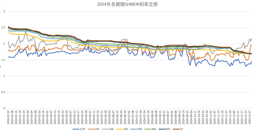 2024年随着央行多次降息,国内利率呈现下行走势。上海银行间同业拆放利率网站数据显示,1个月以上各期限SHIBOR利率在2024年整体呈现下行走势。