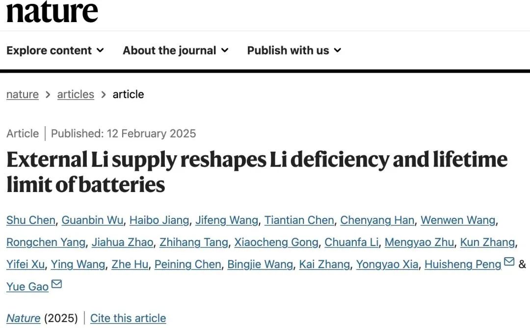 该成果以《外部供锂技术突破电池的缺锂困境和寿命界限》(External Li supply reshapes Li-deficiency and lifetime limit of batteries)为题于北京时间2月13日凌晨在《自然》(Nature)上发表