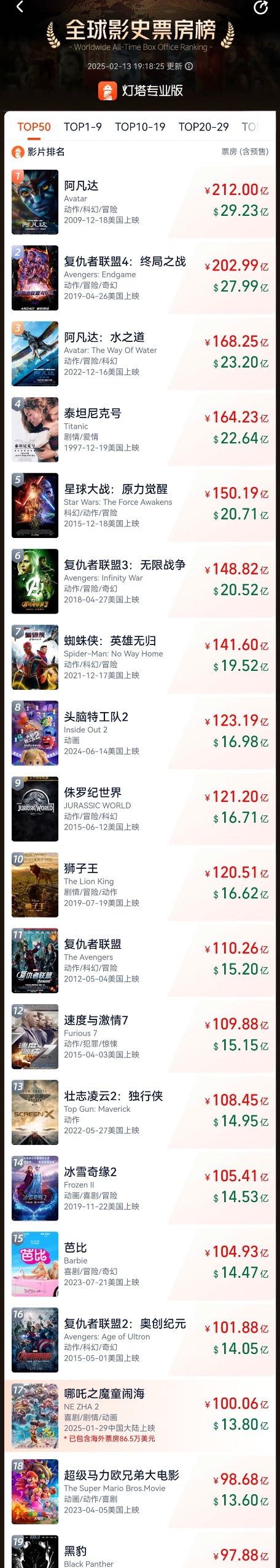 2025年2月13日19时,《哪吒之魔童闹海》(以下简称《哪吒2》)累计票房(含预售)突破100亿元,位于全球影史票房榜第17位、全球动画电影票房榜第三。