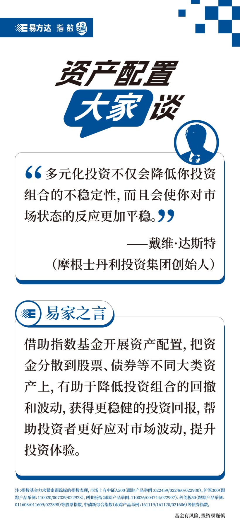 对于投资者而言,可以根据个人风险偏好、投资需求等,将资金配置在不同类型基金产品中。在被动型基金中,代景霞建议,主流宽基指数如沪深300、中证A500等选取的是市场中规模大、流动性好的股票组成,适合追求稳健收益的投资者;行业主题指数较为适合对某些行业或者主题有较强研判能力并且风险承受能力较强的投资者。