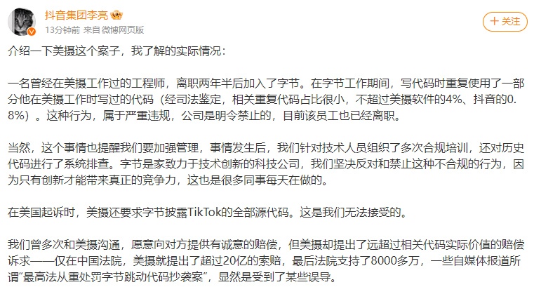 对此,抖音集团李亮在今日发博回应代码抄袭质疑:一名曾经在美摄工作过的工程师,离职两年半后加入了字节。在字节工作期间,写代码时重复使用了一部分他在美摄工作时写过的代码(经司法鉴定,相关重复代码占比很小,不超过美摄软件的4%、抖音的0.8%)。这种行为,属于严重违规,公司是明令禁止的,目前该员工也已经离职。
