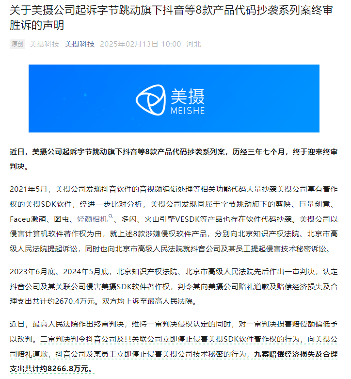 2月13日,美摄科技官方微信公众号发布声明称,美摄公司起诉字节跳动旗下抖音等8款产品代码抄袭系列案,历经三年七个月,近日迎来终审判决。