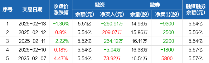 融资方面,当日融资买入938.22万元,融资偿还1199.13万元,融资净偿还260.91万元。融券方面,融券卖出0股,融券偿还9300股,融券余量14.93万股,融券余额248.22万元。融资融券余额合计5.54亿元。