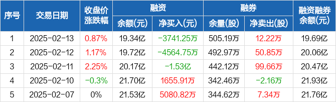 融资方面,当日融资买入2.66亿元,融资偿还3.04亿元,融资净偿还3741.25万元,连续3日净偿还累计2.36亿元。融券方面,融券卖出40.41万股,融券偿还28.19万股,融券余量505.19万股,融券余额3516.15万元。融资融券余额合计19.69亿元。