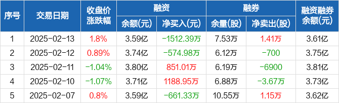 融资方面,当日融资买入1769.56万元,融资偿还3281.95万元,融资净偿还1512.39万元。融券方面,融券卖出1.57万股,融券偿还1600股,融券余量7.53万股,融券余额191.63万元。融资融券余额合计3.61亿元。