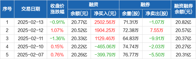 融资方面,当日融资买入6404.75万元,融资偿还3902.19万元,融资净买入2502.56万元,连续3日净买入累计5536.27万元。融券方面,融券卖出6.93万股,融券偿还8万股,融券余量71.31万股,融券余额467.05万元。融资融券余额合计20.82亿元。