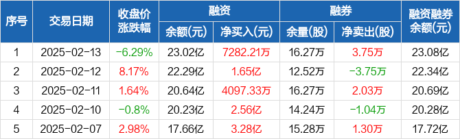 广和通融资融券信息显示,2025年2月13日融资净买入7282.21万元;融资余额23.02亿元,创历史新高,较前一日增加3.27%。
