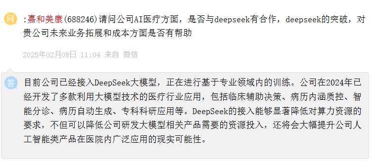 在投资者互动平台上,嘉和美康近日被投资者问及“是否与DeepSeek有合作”,该公司回应称,目前公司已经接入DeepSeek大模型,正在进行基于专业领域内的训练。公司在2024年已经开发了多款利用大模型技术的医疗行业应用,包括临床辅助决策、病历内涵质控、智能分诊、病历自动生成、专科科研应用等。