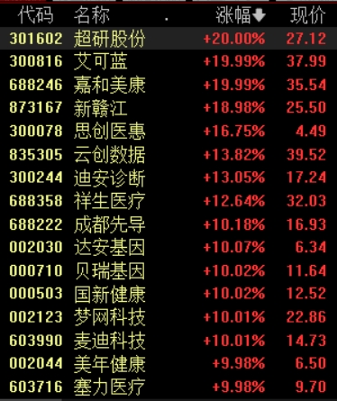 2月14日早盘,智能医疗概念大幅拉升,截至发稿,超研股份、艾可蓝、嘉和美康20%涨停,达安基因、贝瑞基因、国新健康等多股涨停,思创医惠、迪安诊断、祥生医疗等涨幅居前。