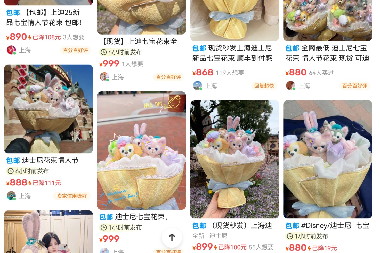 2月12日10时,上海迪士尼度假区官方旗舰店“达菲和朋友们黄色花束”开售,因其中包含7个人气玩偶,被网友称为“七宝花束”。