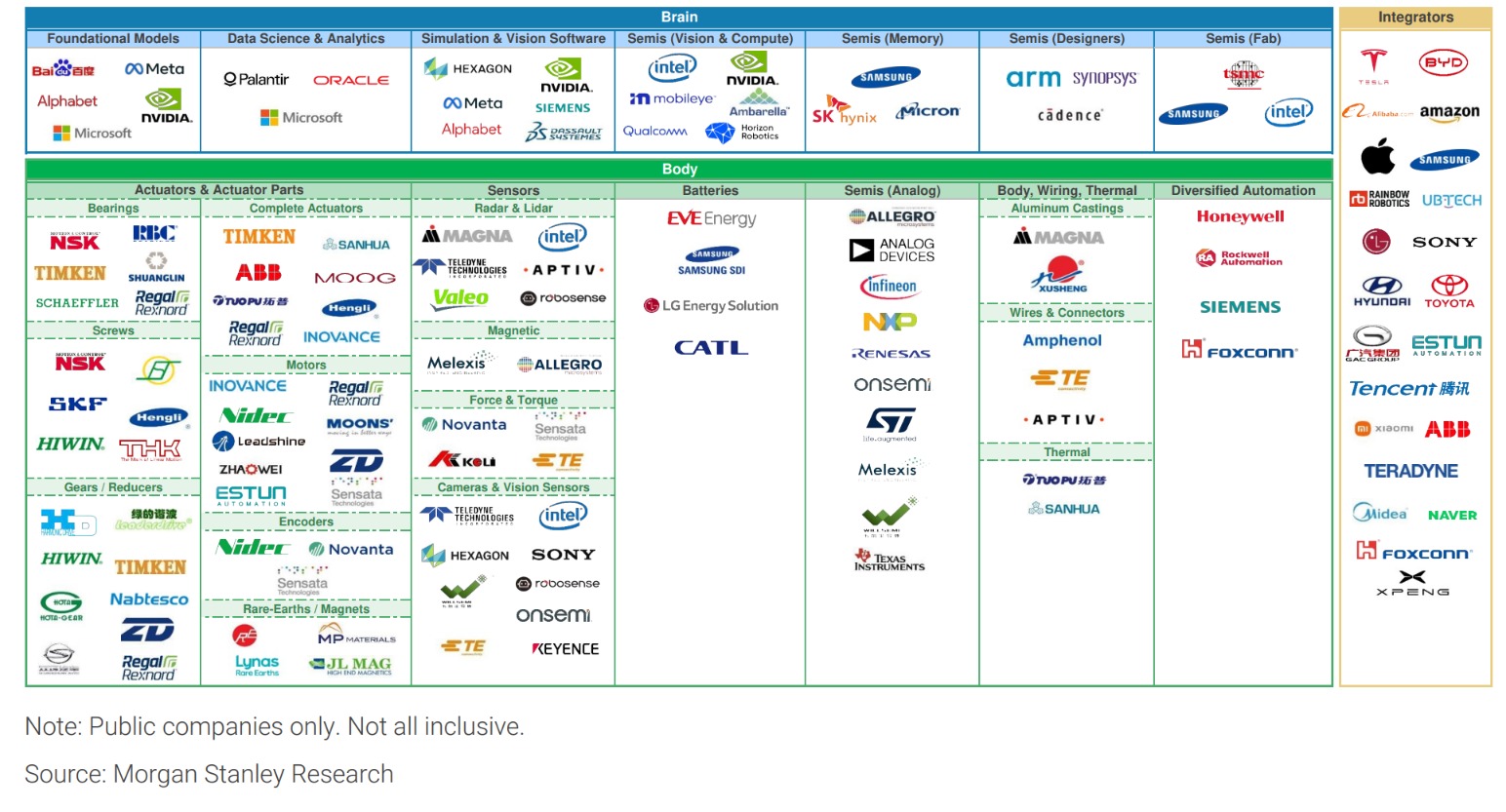 “大脑”类别包括专注于半导体、AI 模型和仿真软件的公司, 这些是使人形机器人能够思考和学习的关键组件。“身体”类别专注于供应关键硬件组件的公司,包括传感器、执行器和电池技术。“集成商”类别则涵盖了积极开发全人形机器人或拥有相关专长的公司。