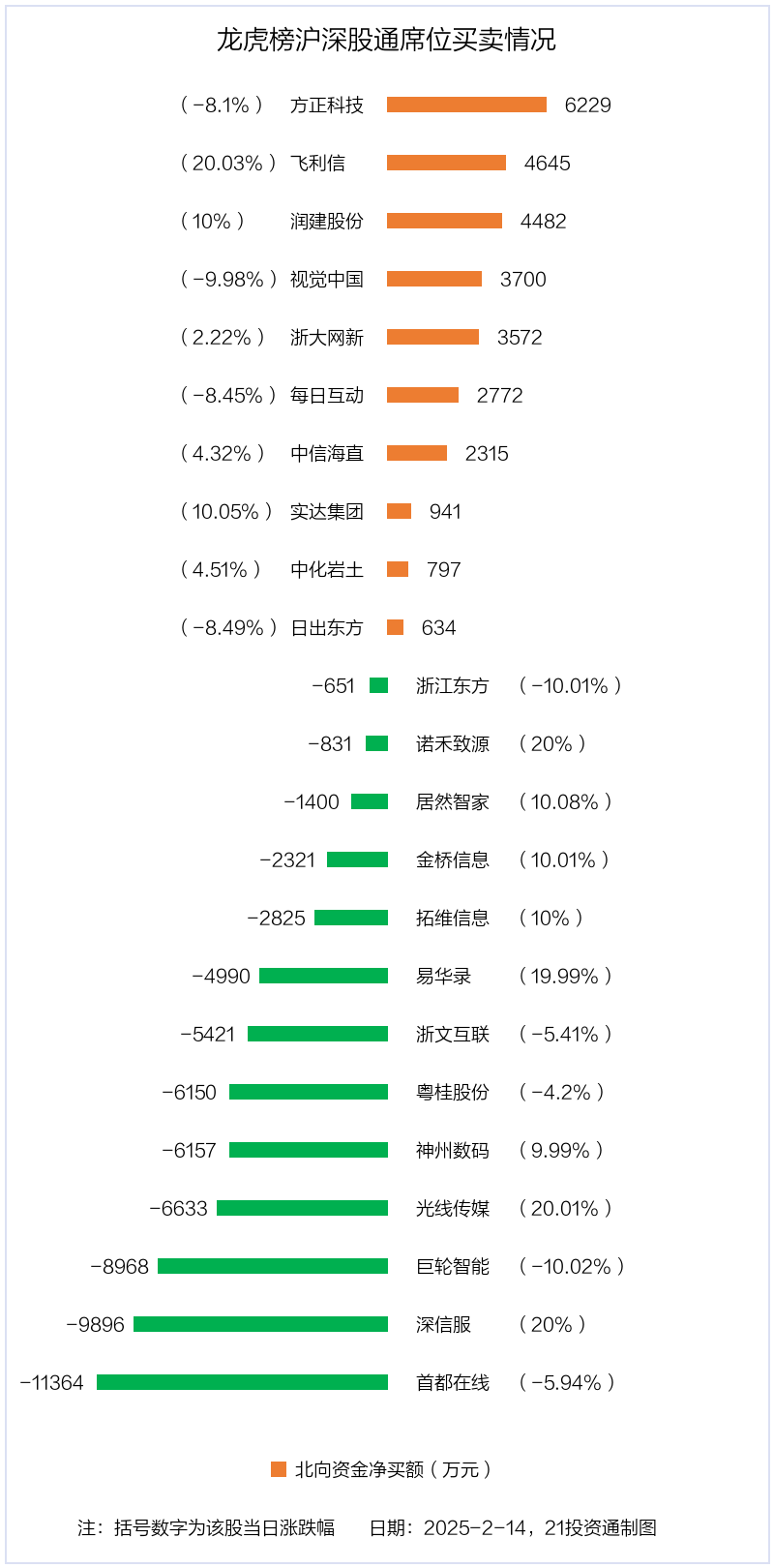2月14日,北向资金参与龙虎榜中的个股共有23只,合计净卖出3.75亿元。其中沪股通净买入4股,净卖出4股,合计净买入2150.76万元;深股通净买入6股,净卖出9股,合计净卖出3.97亿元。