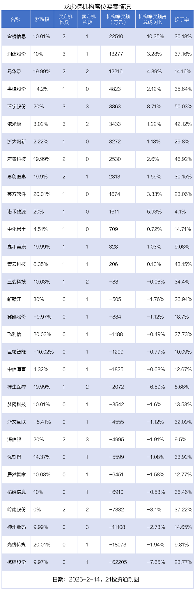 2月14日,31只个股龙虎榜出现了机构的身影,机构合计净卖出6.59亿元。具体来看,机构净买入14股,净卖出17股。