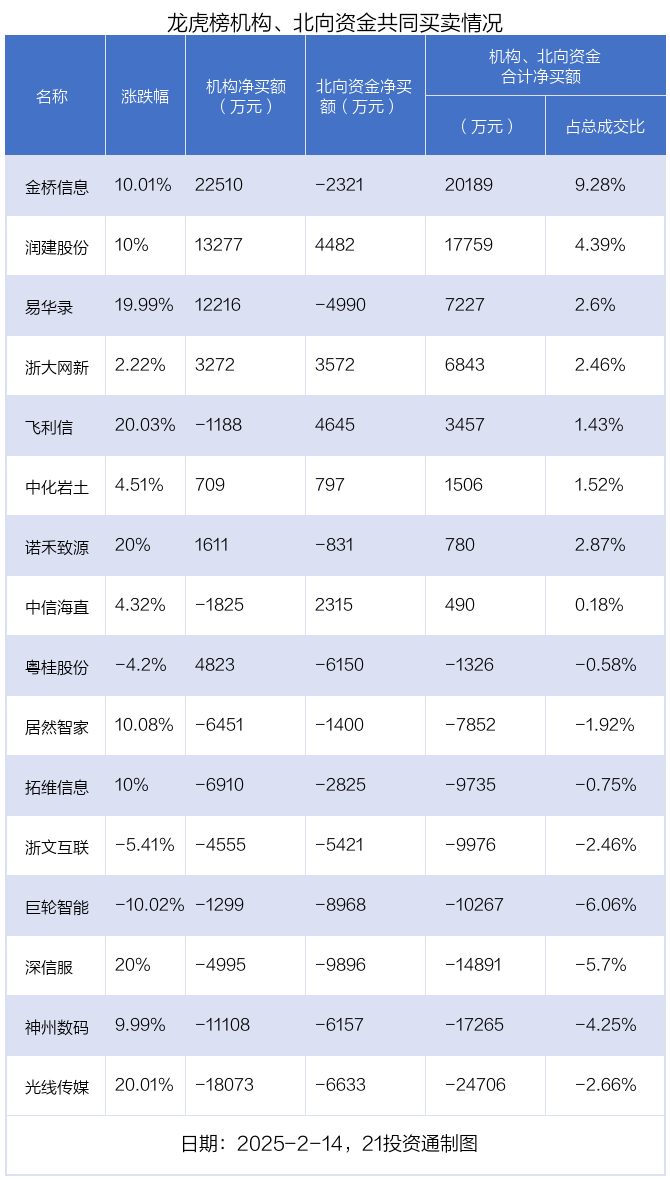 值得注意的是,机构和北向资金共同净买入了润建股份、浙大网新、中化岩土等3股;共同净卖出了居然智家、拓维信息、浙文互联、神州数码、光线传媒、巨轮智能、深信服等7股;在飞利信、中信海直、诺禾致源、金桥信息、易华录、粤桂股份上出现分歧,机构净卖出飞利信1188.06万元,北向资金净买入4644.85万元;机构净卖出中信海直1825.01万元,北向资金净买入2315.1万元;机构净买入诺禾致源1611.24万元,北向资金净卖出831.35万元;机构净买入金桥信息2.25亿元,北向资金净卖出2321.17万元;机构净买入易华录1.22亿元,北向资金净卖出4989.79万元;机构净买入粤桂股份4823.39万元,北向资金净卖出6149.64万元。