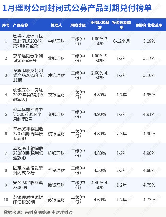 在1月理财公司封闭式公募理财到期兑付榜单中(注:同系列产品仅取一只,投资币种为人民币),9家理财公司产品上榜。中邮理财、北银理财、建信理财、农银理财、交银理财、杭银理财、华夏理财、徽银理财和苏银理财有产品上榜。榜单冠亚军均为目标止盈产品,不过产品规模较小,均不足2千万元。