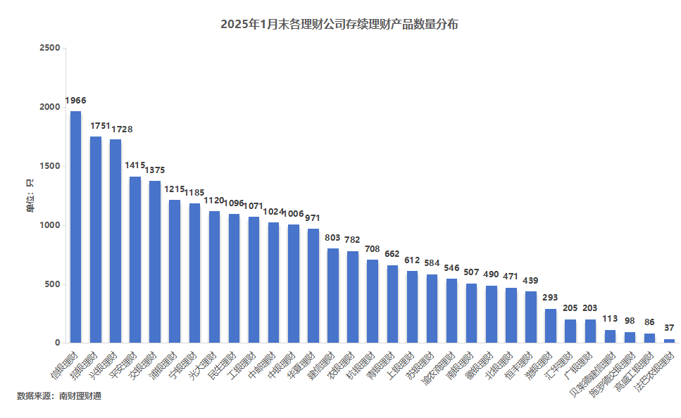 截至1月末,存续理财产品数量最多的是信银理财,存续理财产品数量1,966只,其次是招银理财,有1,751只存续理财产品,兴银理财以1,728只排第三。