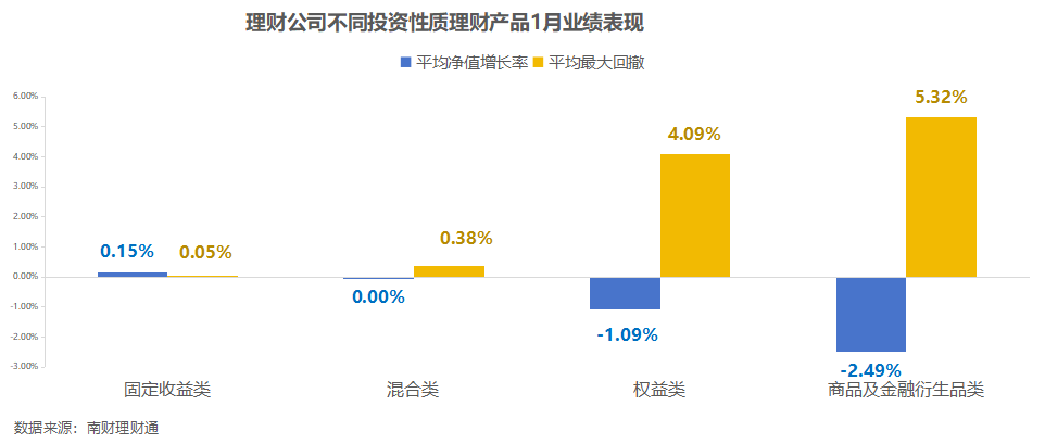 回撤方面,1月以商品及金融衍生品类理财产品回撤幅度最大,平均最大回撤为5.32%,其次是权益类理财产品,今年1月平均最大回撤为4.09%。固收类理财产品回撤依然控制在较低的水平,1月平均最大回撤为0.05%。