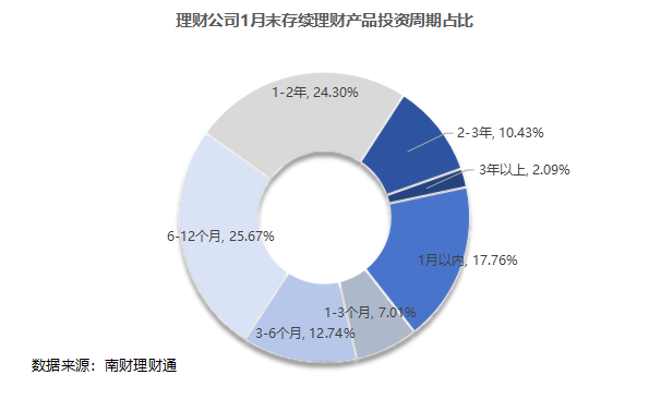从投资周期看,1月理财公司产品期限结构变动不大,3~6个月、6~12个月仍是理财公司的主力发行产品。其中,1月以内的超短期限产品占比17.60%,与去年12月的17.30%基本持平,6-12月期限产品占比环比提高了1.83个百分点,为第一大期限类型,占比24.4%。
