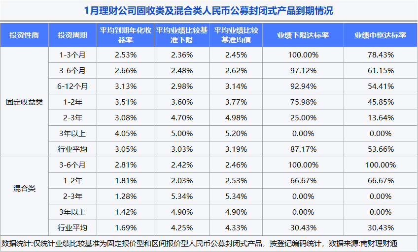 固收类产品业绩下限达标率87.17%,到期年化收益率均值3.05%