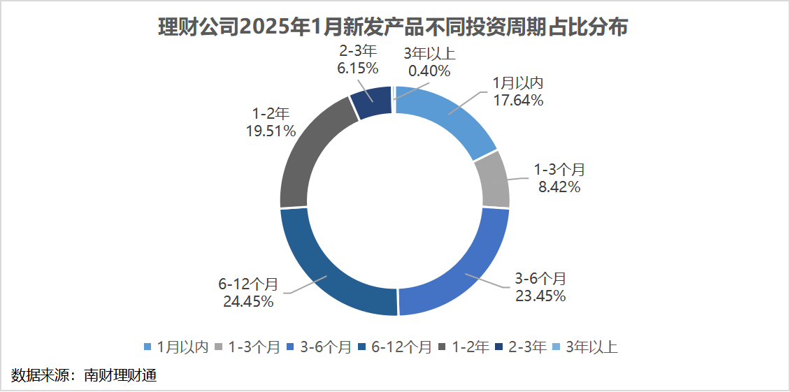 从投资性质上看,理财公司2025年1月新发产品仍以固收类产品为主,产品数量占比超过95%,达到96.5%,与去年12月份的96.8%基本持平,混合类产品发行28只,环比去年12月份的36只有所降低,权益类产品无新发。整体来看,居民对银行理财产品的诉求仍旧是以稳健、低波动为主,这也是较长一段时间的理财产品主线。