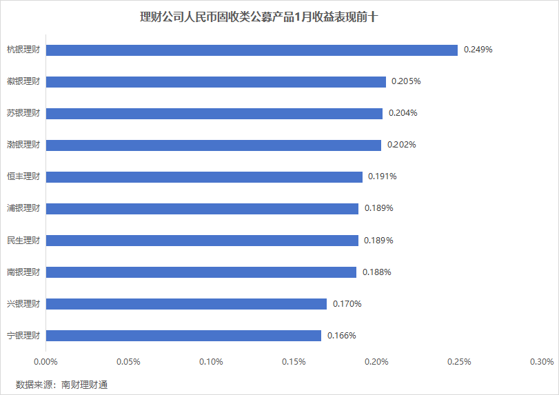 从机构表现来看,人民币公募固收类理财产品1月平均回报最高的是杭银理财,1月平均净值增长率0.25%。徽银理财以0.205%排第二,苏银理财以0.204%。排名前十的理财公司中有一半为城商行理财公司。