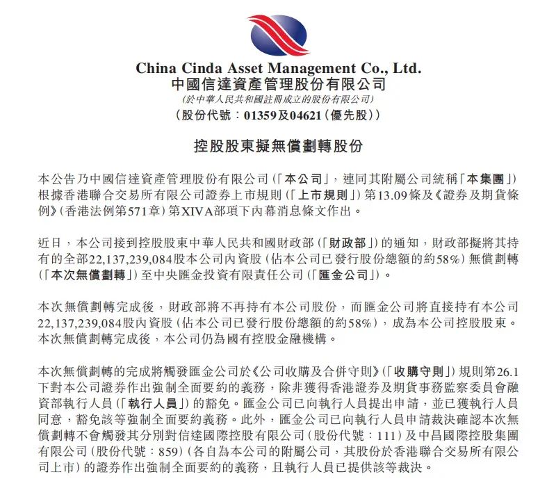 2月14日晚间,中国信达公告称,近日接到控股股东财政部的通知,财政部拟将其持有的全部221.37亿股公司内资股(占公司已发行股份总额的约58%)无偿划转至中央汇金投资有限责任公司(汇金公司)。