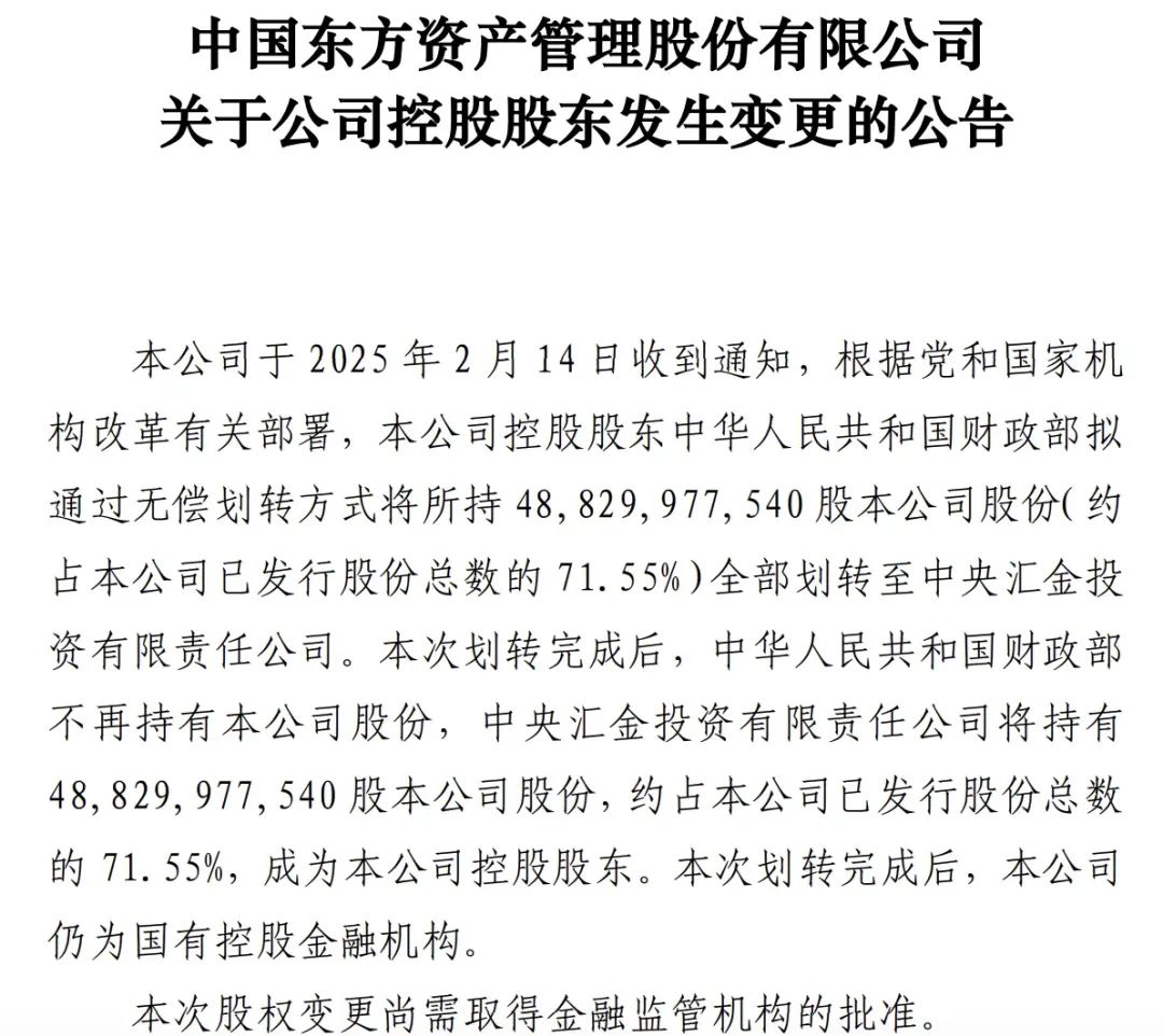 2月14日,中国东方资产管理股份有限公司(简称“中国东方”)发布公告称,公司于2025年2月14日收到通知,根据党和国家机构改革有关部署,公司控股股东财政部拟通过无偿划转方式将所持48,829,977,540股公司股份(约占公司已发行股份总数的71.55%)全部划转至中央汇金投资有限责任公司。