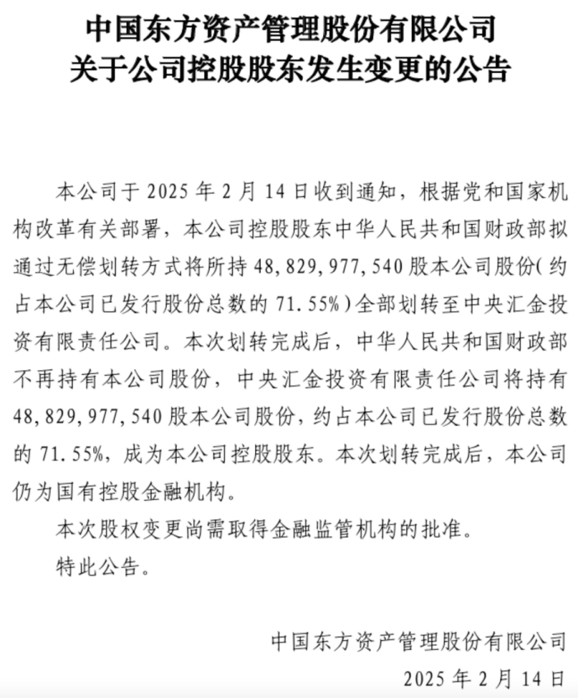 同日,中国东方资产管理股份有限公司(简称“东方资产”)发布关于公司控股股东发生变更的公告,本公司于2025年2月14日收到通知,根据党和国家机构改革有关部署,本公司控股股东中华人民共和国财政部拟通过无偿划转方式将所持488.3亿股股份(约占公司已发行股份总数的71.55%)全部划转至中央汇金。