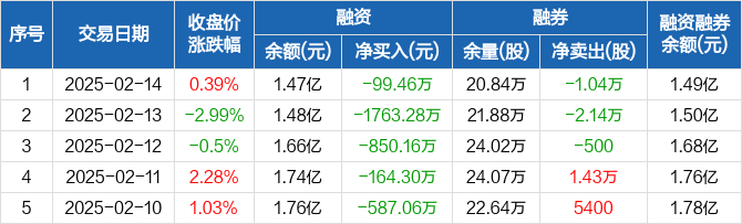 融资方面,当日融资买入962.1万元,融资偿还1061.57万元,融资净偿还99.46万元,连续6日净偿还累计1.01亿元。融券方面,融券卖出2000股,融券偿还1.24万股,融券余量20.84万股,融券余额162.76万元。融资融券余额合计1.49亿元。
