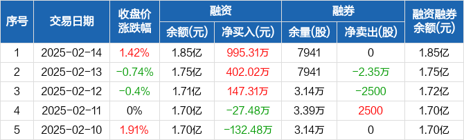 融资方面,当日融资买入2563.21万元,融资偿还1567.91万元,融资净买入995.31万元,连续3日净买入累计1544.64万元。融券方面,融券卖出0股,融券偿还0股,融券余量7941股,融券余额11.89万元。融资融券余额合计1.85亿元。