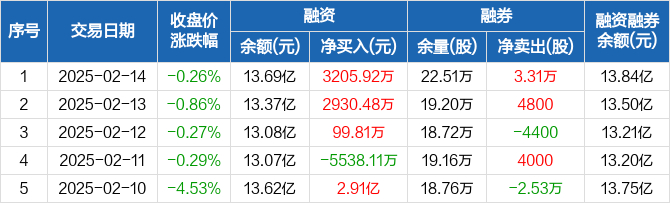 拓普集团融资融券信息显示,2025年2月14日融资净买入3205.92万元;融资余额13.69亿元,创历史新高,较前一日增加2.4%。