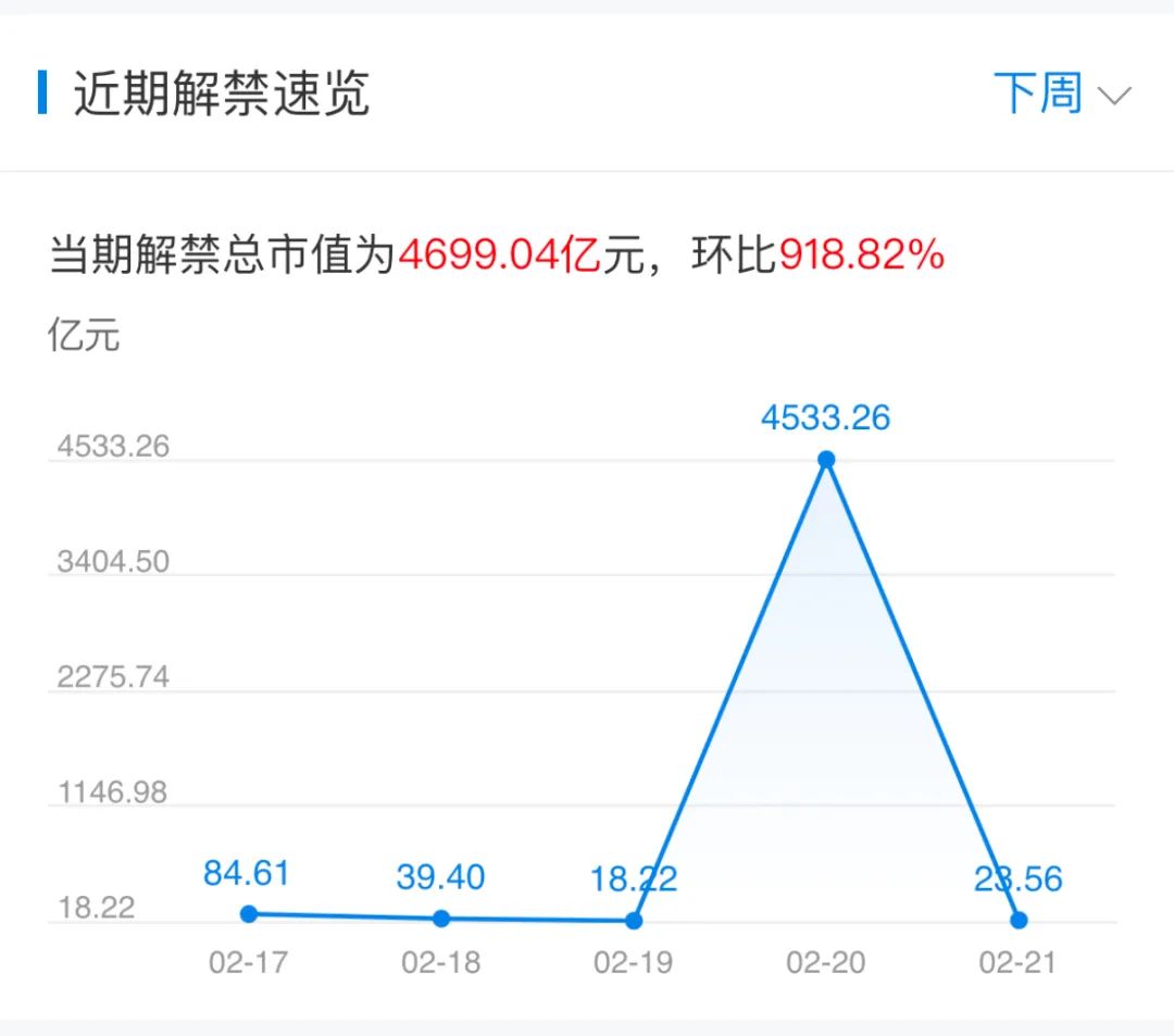 下周(2月17日至2月21日)有51家公司限售股陆续解禁,当期解禁总市值为4699.04亿元,环比918.82%。