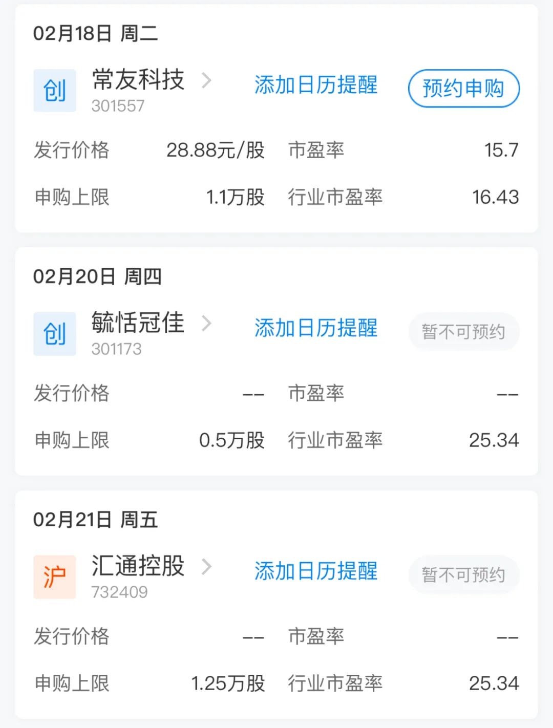 明天(2月17日)A股没有新股上市。下周有3只新股申购,分别为常友科技、毓恬冠佳、汇通控股。
