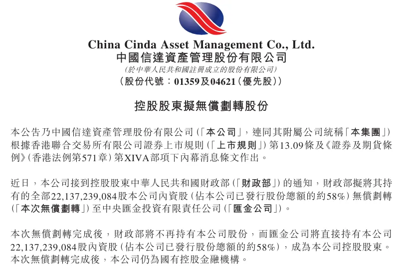 除了证金公司,中国信达2月14日在港交所公告,近日接到控股股东财政部的通知,财政部拟将其持有的221.37亿股公司内资股(占公司已发行股份总额的约58%)无偿划转至中央汇金。无偿划转完成后,财政部将不再持有公司股份,中央汇金将直接持有公司221.37亿股内资股,成为公司控股股东。本次无偿划转完成后,公司仍为国有控股金融机构。