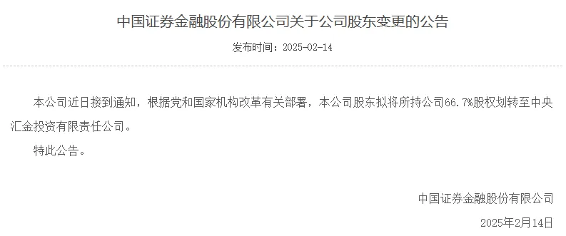 2月14日,中国证券金融股份有限公司(简称“证金公司”)发布关于公司股东变更的公告。