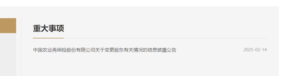 中国农业再保险股份有限公司公告,其控股股东财政部将其持有的中国农业再保险的全部股份(占总股本的55.90%),无偿划转给中央汇金投资有限责任公司。划转完成后,财政部将不再持有任何中国农业再保险股权,中央汇金将持有中国农业再保险约55.90%股份,成为公司控股股东。