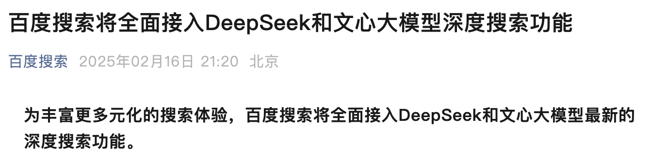 百度搜索将全面接入DeepSeek和文心大模型深度搜索功能