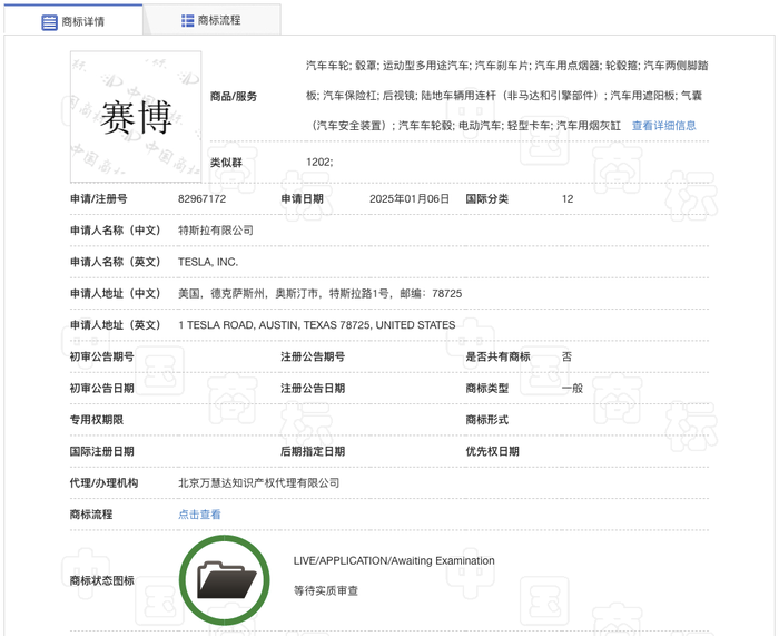 2月17日,中国商标网显示,特斯拉有限公司于2025年1月6日申请注册“赛博”中文商标,国际分类为“12-运输工具”。商标流程显示,该申请已获受理。