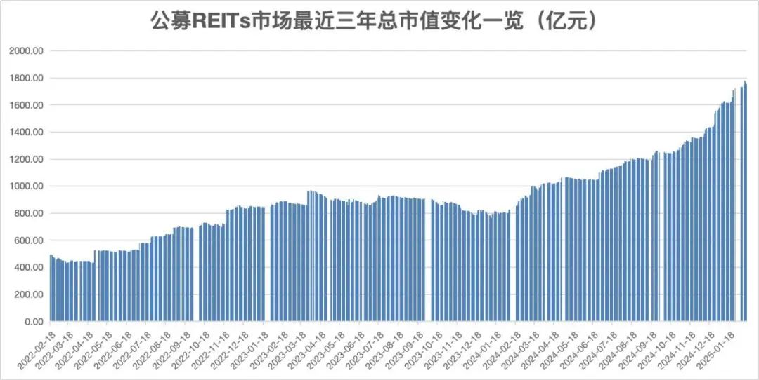 数据显示,2月12日,中证REITs全收益指数盘中触及1064.6点,创出历史新高,全市场公募REITs总市值一度突破1779亿元。尽管最近几个交易日有些波动,但总市值依旧维持在1700亿元之上。