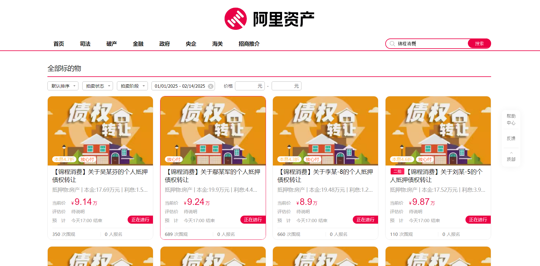 阿里拍卖平台信息显示,锦程消金此次挂拍的个人抵押债权本金多在10万-30万元区间,抵押物集中于二线及以下城市住宅房产,且多为第二顺位抵押,处置优先级较低。以其中一笔债权为例,本金14.61万元,债权总额20.21万元,起拍价仅2.86万元,虽获6352次围观却无人出价;在另一条债权转让信息中,本金为6.05万元,拍卖价低至3173元,折扣低至本息0.5折,一次出价。整体看来,流拍现象十分普遍。