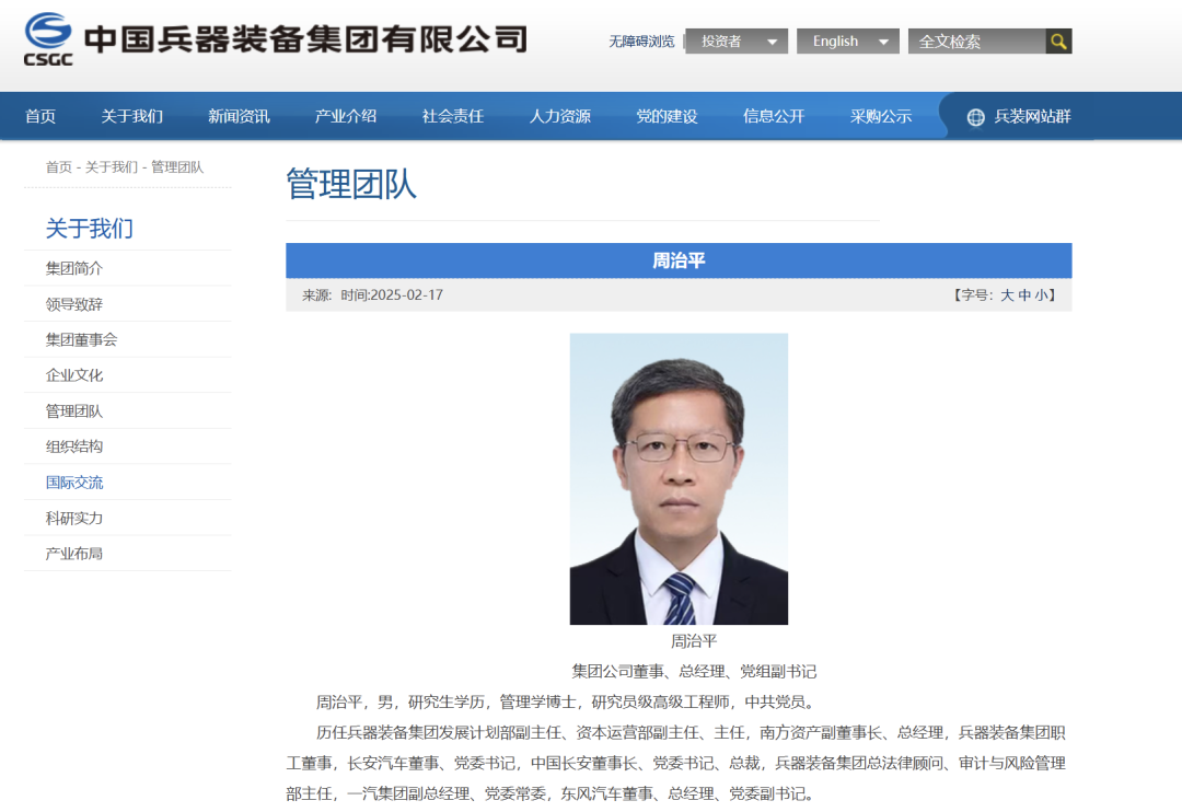2月17日,中国兵器装备集团官网“集团董事会”“管理团队”等栏目更新内容显示,周治平已任中国兵器装备集团公司董事、总经理、党委副书记。