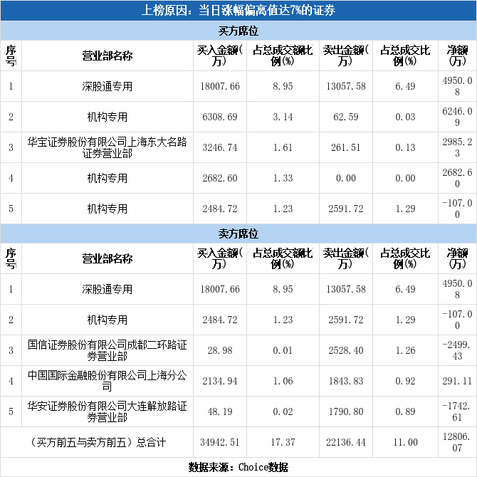 今日龙虎榜单上出现了深股通的身影,占据了买一、卖一的位置,净买入4950.08万元,占当日成交总额的2.46%。