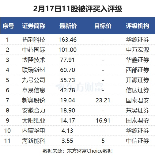 东方财富Choice数据显示,截至2月17日17点,当天有11股被券商评为买入评级,包括拓荆科技、中芯国际、九号公司、内蒙华电等股票。