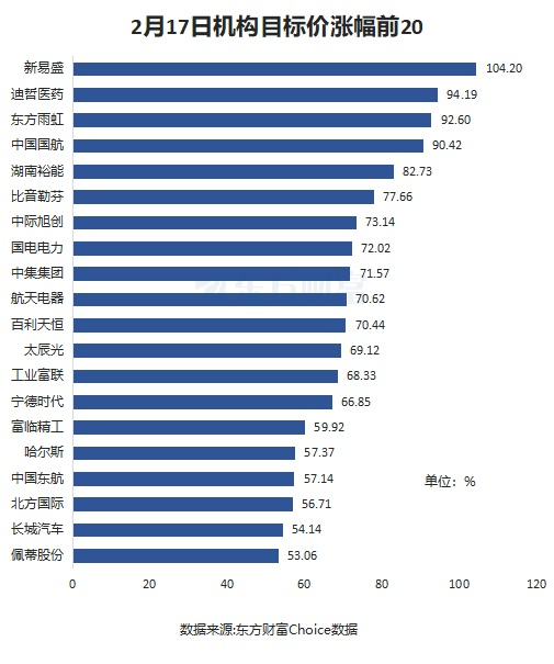 以近一月券商研报为样本,按机构目标价(有多家券商给出目标价的,取最大值)和最新收盘价相比,截至2月17日收盘,新易盛上涨空间最大,为104.2%。