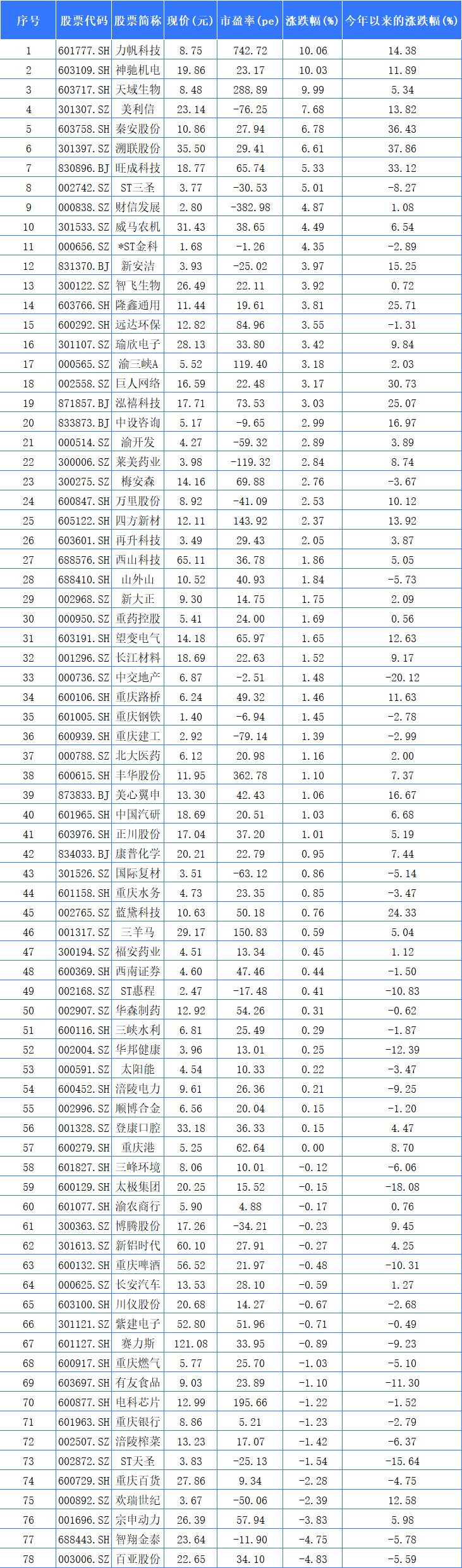 2025年2月17日,78家重庆A股上市公司中有56家上涨。