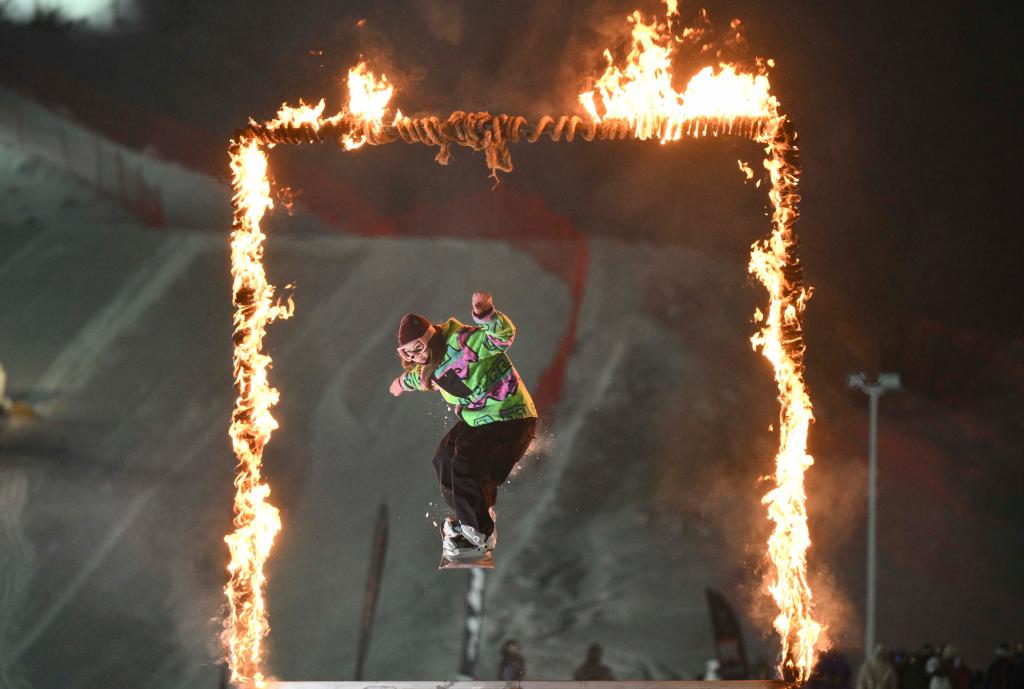 1月29日,雪友在新疆将军山国际滑雪度假区新春趣味滑雪公园跳台活动上钻过火圈。新华社记者胡虎虎摄
