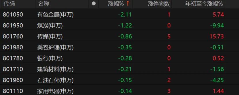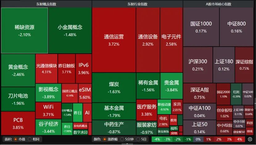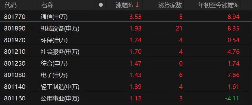 今日市场交投氛围浓厚,且板块分化明显。31个申万一级行业中,22个收涨,通信板块以3.53%涨幅领涨,机械设备、环保、社会服务涨约2%,电子、轻工制造公用事业涨幅超过1%;而有色金属跌幅超2%,煤炭、传媒跌约1%。